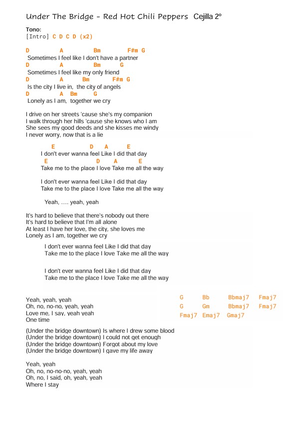 Under the bridge · Red Hot Chili Peppers La cancion original es con cejilla traste 4º, lo adaptamos a cejilla traste 2º Under the Bridge Intro Under the Bridge Estribillo Under the Bridge final
